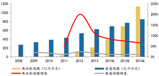 2013年全球用于電動汽車、儲能 裝置的高性能隔膜出貨量2.1億m2,需求占比達25%,預計2016年,全球高性能隔 膜出貨量將達11.35億m2,需求占比達57%,2013-2016年期間復合增長率達75%。從增長率來看,高性能隔膜2012年以來增長率雖然出現一定程度下滑,但始終保持 50%以上的增速,而普通隔膜的增速則保持在10%左右的水平。高性能隔膜將成為 未來鋰電池隔膜市場的主要需求增長點。