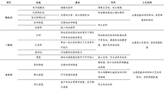 在鋰離子電池容量、循環性能、充放電電流密度等關鍵 性能的決定因素中,鋰離子電池隔膜角色不可小覷。因此,通常要求隔膜具有優異 的化學穩定性、熱穩定性和力學穩定性,并達到一致性和安全性等物理特征。穩定性主要受基材的影響,實現難度較低;一致性則主要有工藝決定,實現難度較高; 安全性由基材和工藝共同決定,實現難度亦較高。