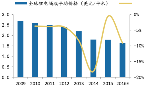 根據2009~2015年全球鋰電隔膜實際產值以及相應市場規模,可以計算得到平均鋰電隔膜市場價格。2009年來,鋰電隔膜價格保持著下跌趨勢,尤其是2012年來,隨著產能的增加,價格跌幅一度接近20%。根據預測, 2017年全球鋰電池隔膜的產值將達到42.6億美元,根據2016-2017年全球產值 和產量的預測值,計算得2016-2017年隔膜的價格保持下降的趨勢,分別為1.79美元 /平米和1.63美元/平米。明顯,可以注意到,由于價格下降,產值增幅低于產量增幅。 未來,隨著鋰離子電池隔膜的逐步產業化和產量的逐步增加,尤其是中國隔膜企業 隔膜產品性能的逐步提升,這一趨勢將持續。