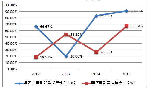 2012-2015年中國國產電影及國產動漫電影票房增長率