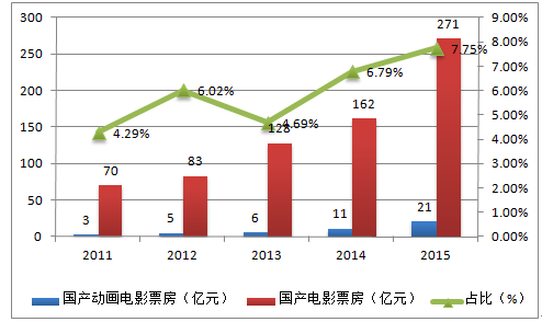 排名片名內地票房(億)上映年份1西游記之大圣歸來9.5620152大魚海棠5.6620163熊出沒之雪嶺熊風2.9620154熊出沒之熊心歸來2.8820165熊出沒之奪寶熊兵2.4720146喜洋洋與灰太狼之開心闖龍年1.6620127喜洋洋與灰太狼之兔年頂呱呱1.520118喜洋洋與灰太狼之虎虎生威1.2820109喜洋洋5喜氣洋洋過蛇年1.25201310十萬個冷笑話1.22014國產動畫電影市場票房表現尤為亮眼。2011~2015年間,國產電影的國內票房總額增長了約4倍。其中,國產動畫電影票房由2011年的3億元增長到了2015年的21億元,增長7倍,遠快于國產電影票房整體。目前,國產動畫電影已經越來越受到觀眾們的重視與歡迎,國產動畫電影占國產電影比重越來越高,由2011年的4.29%增長到2015年的7.75%。