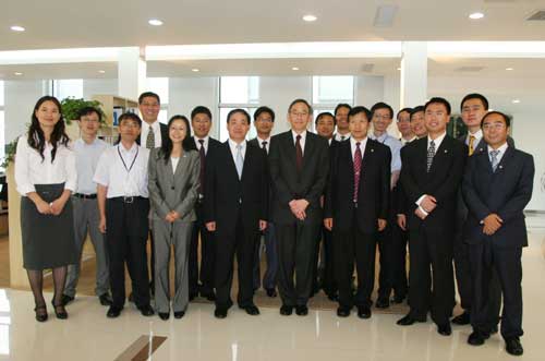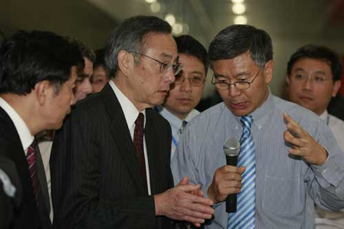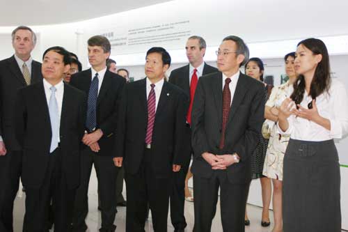 新奧光伏李洪文博士為朱棣文詳細介紹新奧光伏硅基薄膜太陽能電池板生產情況