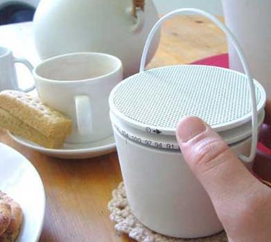 我們今天為大家介紹的這款收音機是由陶瓷制成的,調頻旋鈕被設計在了頂部,可以通過一側的刻度來了解當前的頻率。音箱同樣位于頂部。而且為了方便移動,它還設計有一個提手。