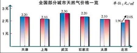 與全國大中城市相比,本市的民用天然氣價格偏低。如天津市的民用天然氣價格為2.20元/立方米,上海為2.10元/立方米,武漢為2.30元/立方米,石家莊為2.20元/立方米,太原為2.10元/立方米,而北京市目前民用天然氣價格為1.90元/立方米。