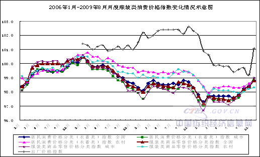 (二)價格維持低位,上揚之勢明顯2009年上半年,消費價格指數始終在低位徘徊,8月份開始回升,四季度回升勢頭更為明顯。大型零售店商業企業服裝消費價格指數也大體呈現相同趨勢。出廠價格指數也于11月份跳出低估,回漲至100以上。年底出廠價格指數回升與原材料價格關系密切,冬季產品使用的化纖產品、羊毛產品、羽絨產品的價格都在上揚,服裝加工成本上漲,出廠價格上升成為必然,出廠價格能否持續上升還要看市場需求回暖情況。服裝類商品零售價格指數衣著類居民消費價格指數2009年1-11月全國97.897.9城市97.797.7農村98.198.4數據來源:國家統計局