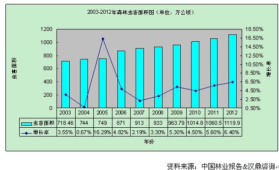 國(guó)務(wù)院公布的“第七次全國(guó)森林資源清查結(jié)果”顯示,我國(guó)森林面積達(dá)19545.22萬(wàn)公頃,森林覆蓋率達(dá)20.36%。2008年末,我國(guó)主要林業(yè)有害生物發(fā)生面積約為1200萬(wàn)公頃,按照每公頃生物農(nóng)藥防治成本200元計(jì)算,2008年我國(guó)林業(yè)領(lǐng)域生物農(nóng)藥市場(chǎng)規(guī)模約為24億元,林業(yè)領(lǐng)域真菌源生物農(nóng)藥的市場(chǎng)規(guī)模約為13億元。2009年11月,國(guó)家林業(yè)局通過《應(yīng)對(duì)氣候變化林業(yè)行動(dòng)計(jì)劃》,2020年森林面積將比2005年增加4000萬(wàn)公頃,真菌源生物農(nóng)藥憑借其顯著的比較優(yōu)勢(shì),在林業(yè)領(lǐng)域的應(yīng)用深度和廣度將進(jìn)一步深化和拓展,預(yù)計(jì)未來5年,國(guó)家對(duì)林業(yè)生物防治投入的持續(xù)加大,林業(yè)用真菌源生物農(nóng)藥的需求規(guī)模將保持每年20%左右的增長(zhǎng)速度。