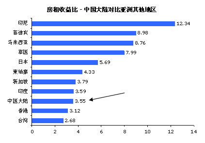 第二個令人擔憂的趨勢是房租收益比相對較低。按照一般的估計,中國城市平均房租收益比約為3.55%,比照很多亞洲國家和地區的水平,中國的房租收益比顯得較低,僅高于臺灣和香港地區的水平,甚至低于日本?紤]到中國的按揭貸款利率約為6%左右,這樣的一個房租收益率對于購房者來說,只能意味著長期的負現金流。與此同時,我們也選取了中國主要城市的樣本來進行分析,研究顯示,其房租收益比與中國平均水平接近,同時,我們也發現,小戶型房屋的房租收益比相對較高。按照這樣的趨勢,中國的房地產投資將顯得更加投機和高風險。