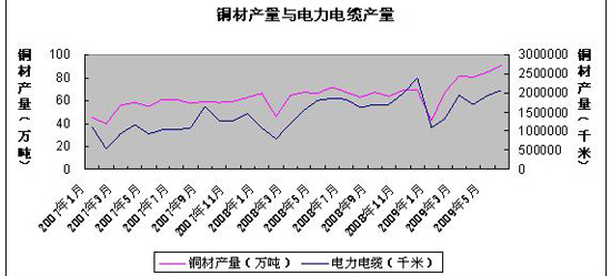 銅材產量與電力電纜圖表顯示,銅材產量2007年月均在50萬噸級,08年為60萬噸級,而09年上半年已經站上70萬噸級,1、2月份的下滑被3月以后不斷刷新的歷史記錄補足,而電力電纜曲線基本與之同步增減,6月產量逼近2008年12月的歷史紀錄238.35萬千米。由此可以說,3月份來用銅量的逐漸增加主要集中在以電力電纜為代表的電線電纜行業。
