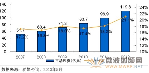 圖1. 2007至2012年我國醫(yī)用射頻與核磁儀器市場規(guī)模與增長
