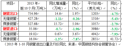 “2013年前10個月鋼管出口雖然顯現量升價跌態勢,但出口均價還是遠低于進口均價,鋼管的進口均價是出口均價的3.31倍。”鐘錫弟說。據悉,2013年1-10月鋼管出口754.96萬噸,同比凈增14.6萬噸,增幅1.97%;鋼管進口量35.06萬噸,同比降0.7萬噸,降幅為1.96%;但鋼管出口均價是1203美元/噸,進口均價為3986美元/噸,進口均價是出口均價的3.31倍。
