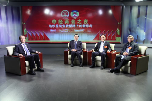 中國紡織工業聯合會副會長徐文英(左二),全國人大代表、中國絲綢博物館館長趙豐(右一),全國人大代表、華之毅時尚集團總裁張華明(右二)做客中經兩會之夜節目。三位嘉賓圍繞“紡織服裝業轉型路上的新思考”等話題與網友進行交流。 、