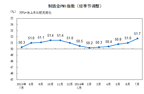 核心提示:2014年7月中國(guó)制造業(yè)采購(gòu)經(jīng)理指數(shù)為51.7% 環(huán)比升0.7%