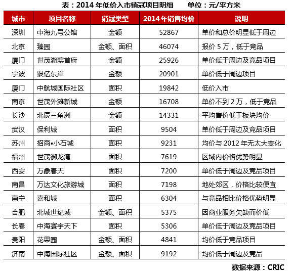 從2014年16個低價入市的銷冠項目來看,絕大多數項目入市價格相比競品項目或周邊項目有明顯的價格優勢,對剛性需求或改善型需求產生較大的吸引大,其成交量也與普通項目先抑后揚的表現不同,上下半年成交量均保持較好的勢頭。