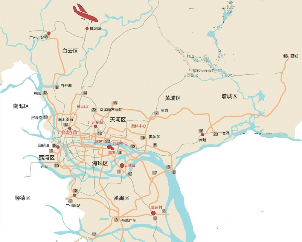 18號線廣州南站至白鵝潭段:北延至白鵝潭,延長后長度約68公里,將利好南沙、南站、廣鋼三大板塊。