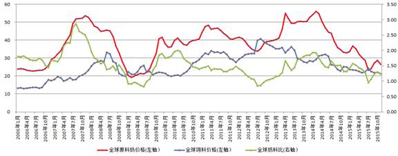 11月份國際原料奶價格和飼料價格均出現(xiàn)下跌,但原料奶價格跌幅更大,奶農(nóng)盈利空間有所收窄,反映奶農(nóng)盈利空間的指標—奶料比回落至1.25,比2012年7月的歷史低點0.85高47.7%。