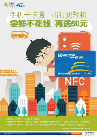活動期間,電信用戶均可免費辦理帶一卡通功能的NFC-UIM卡,為手機增添一卡通功能,實現乘坐地鐵、公交直接刷手機上車。同時,開通4G合約套餐,即可獲贈50元一卡通充值券;辦理3G升級4G業務,即可獲贈20元一卡通充值券。