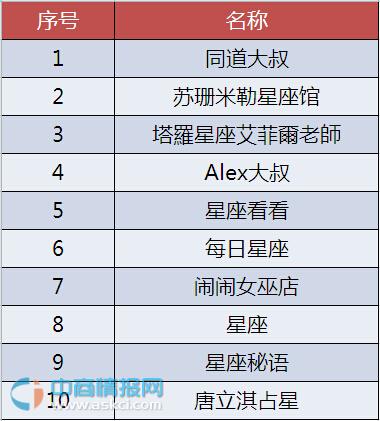核心提示: 如今,微信基本上成為了智能手機的“標配”,根植在微信中的公眾號也逐漸成為網民們獲取資訊的重要渠道。然而類別繁多的公眾號,也讓不少網民有點“頭大”,因而如何在冗如今,微信基本上成為了智能手機的“標配”,根植在微信中的公眾號也逐漸成為網民們獲取資訊的重要渠道。然而類別繁多的公眾號,也讓不少網民有點“頭大”,因而如何在冗雜的公眾號中快速找到合適的、有價值的信息源就顯得極為重要。為此,中國產業發展研究網整理了2015年十大星座類微信公眾號,此次上榜的有同道大叔、蘇珊米勒星座館、塔羅星座艾菲爾老師、Alex大叔、星座看看、每日星座、鬧鬧女巫店、星座、星座秘語及唐立淇占星等優秀公眾號。