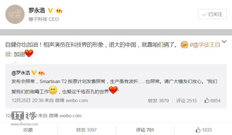 羅永浩表示:“發(fā)布會(huì)照常,SmartisanT2按原計(jì)劃發(fā)售照常,生產(chǎn)雖有波折......也照常。請(qǐng)廣大錘友們放心。‘我們愛(ài)我們的倒霉工作,也愛(ài)這千瘡百孔的世界’”。另外同樣準(zhǔn)備要做手機(jī)的相聲演員王自健也轉(zhuǎn)發(fā)了該微博,兩人互相鼓勵(lì),羅永浩言語(yǔ)間有些自嘲的意味。