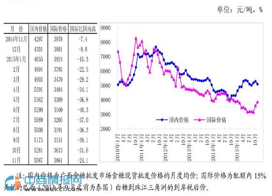 (三)國(guó)內(nèi)國(guó)際價(jià)差進(jìn)一步縮小。11月,進(jìn)口配額內(nèi)15%關(guān)稅的巴西食糖到岸稅后價(jià)每噸3861元,環(huán)比漲248元,漲幅6.9%;比國(guó)內(nèi)糖價(jià)每噸低1226元,價(jià)差比上月縮小442元。進(jìn)口配額外50%關(guān)稅的巴西食糖到岸稅后價(jià)每噸4884元,環(huán)比每噸漲324元,漲幅7.1%,比國(guó)內(nèi)糖價(jià)每噸低203元,價(jià)差比上月縮小518元。