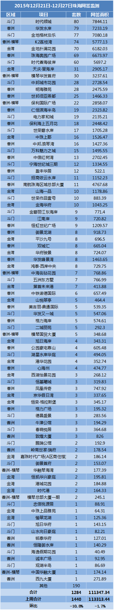 核心提示: 新浪樂居與合富輝煌聯合公布的珠海市區網簽數據顯示,12月21日-12月27日,珠海市區累計成交套數1284套,環比下降10.8%;銷售面積111347.34㎡新浪樂居與合富輝煌聯合公布的珠海市區網簽數據顯示,12月21日-12月27日,珠海市區累計成交套數1284套,環比下降10.8%;銷售面積111347.34㎡,環比上漲31.7%。