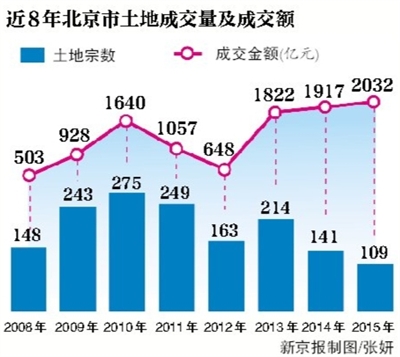 據(jù)亞豪機(jī)構(gòu)統(tǒng)計(jì),2015年北京土地市場(chǎng)以2032億的土地出讓金收官,同比增長(zhǎng)6%,創(chuàng)歷史新高。另一方面,土地成交面積并未隨著土地成交金額的增長(zhǎng)而水漲船高。亞豪機(jī)構(gòu)數(shù)據(jù)顯示,2015年北京共出讓109宗土地,相比去年減少了32宗。