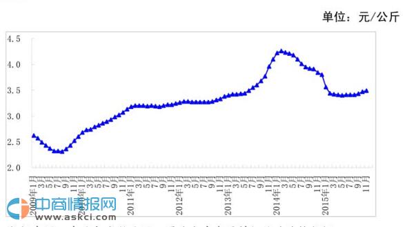。ㄒ唬┰夏淌召弮r格繼續小幅回升。11月,我國奶業主產省原料奶月均收購價每公斤3.49元,環比漲0.6%,同比跌9.1%,全國監測城市鮮奶平均零售價每斤5.28元,環比跌0.3%,同比跌1.8%。其中,袋裝鮮奶每斤4.79元,環比跌0.2%,同比跌2.2%,盒裝鮮奶每斤5.76元,環比跌0.3%,同比跌1.4%。