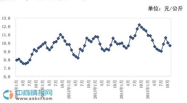(一)雞蛋價格繼續(xù)回落。全國雞蛋零售均價繼8、9月份大幅上漲后,10月份快速回落,11月份繼續(xù)下跌。據(jù)農(nóng)業(yè)部監(jiān)測,11月份,全國雞蛋零售均價每公斤9.71元,環(huán)比跌2.6%,同比跌16.8%。從周價格走勢看,11月各周雞蛋價格走勢平穩(wěn)。其中第1周每公斤9.70元,環(huán)比持平;第2周每公斤9.73元,環(huán)比持平;第3周9.67元,環(huán)比持平。