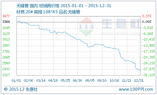 據生意社價格監測,自2015年初以來,20#無縫管市場價格一路下滑,跌跌跌不休。從1月初的3364.44元/噸,下跌950元/噸至目前的2414元/噸,跌幅約為28.25%。1月、12月分別為20#無縫管價格的最高點和最低點,主要原因是,年前各地庫存較低,1月遇到需求集中釋放,再加上利好信息的推漲,推高了無縫管價格;12月為傳統消費淡季,市場需求慘淡,年末商家為了回籠資金,頻頻下調價格促進銷量。