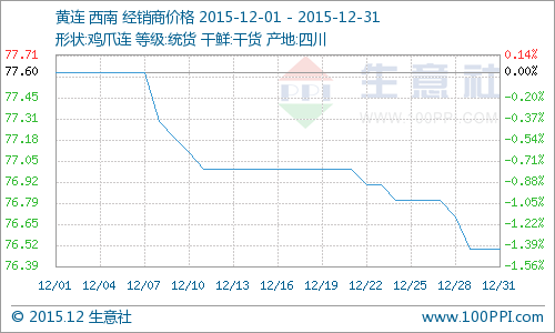 據(jù)監(jiān)測數(shù)據(jù)顯示,2015年12月國內(nèi)黃連價格下行,月初報77.6元/公斤,月末報76.5元/公斤。本月黃連價格微幅下降,降幅為1.42%。