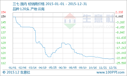 據(jù)數(shù)據(jù)統(tǒng)計(jì)顯示,1月初三七120頭報(bào)價(jià)150.9元,12月底三七報(bào)價(jià)116.2元,2015年度三七整體行情下跌,全年跌幅23.0%。2015年行情最高點(diǎn)出現(xiàn)在1月12日,報(bào)150.9元;最低點(diǎn)出現(xiàn)在12月15日,報(bào)115.8元。2015年年度三七行情有一次明顯上漲趨勢(shì),出現(xiàn)在5-6月份;其余行情整體為下跌,其中3月下旬到5月中上旬,三七整體下跌速度快,幅度大,4個(gè)月跌幅達(dá)到17.4%。