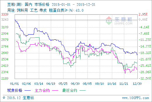 核心提示: 由2015年豆粕現期走勢圖可以看出:2015年豆粕期價寬幅振蕩為主,可以分為四個階段。第一階段:1-4月,連豆粕振蕩下行。1月,南美大豆豐產前景進一步明朗,打