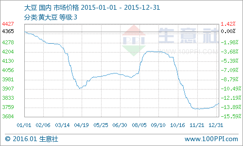 據數據監測顯示,2015年國內大豆價格大幅震蕩下行,2015年1月1日3等黃大豆均價為4365.33元/噸,12月31日均價為3792.00元/噸,大幅下跌13.13%。