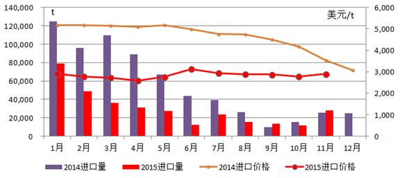 中國全脂奶粉進口量及進口價格2014.01-2015.11