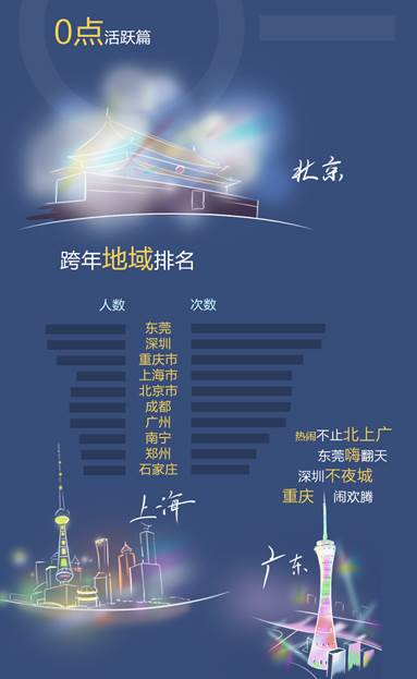 零點來臨之際,全國各城市跨年人數前十中居然有三座來自廣東省,包括排名第一的東莞市和第二的深圳市,看來廣東省才是真正的不夜城呀。不僅有東莞市以最高活躍人數嗨翻QQ空間,重慶也不甘落后,想來山城跨年的夜景肯定格外美麗,大家都忍不住上傳照片呢~