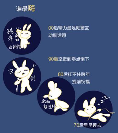 從參與跨年用戶的年齡來看,精力最充沛的是00后這群小鮮肉們,話題刷刷的互動最頻繁。90后的大哥大姐們還可以熬到0點,80后的叔叔阿姨扛不到跨年就提前寫下祝福,而70后已經早早睡去。