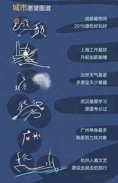 不同的城市,不同的夢想。首都人民在為人民服霧一年后,異口同聲希望迎來“2016藍”。享樂派的包括成都人民愿永遠吃好玩好,杭州人民愿來一場說走就走的旅行。現實派的包括上海人民希望升職跳槽加薪,廣州人民找對象,而武漢的學生們希望逢考必過。