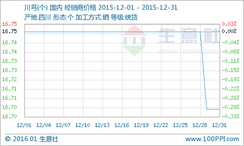 據監測數據顯示,2015年國內川芎價格呈上漲趨勢,年初報15.90元/公斤,年末報16.70元/公斤,上漲幅度為5.03%。