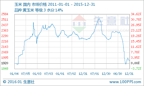 據監測數據顯示,2015年國內玉米市場價格整體大幅下跌,12月31日國內3等黃玉米市場均價為1958.00元/噸,較年初大幅下跌13.39%。