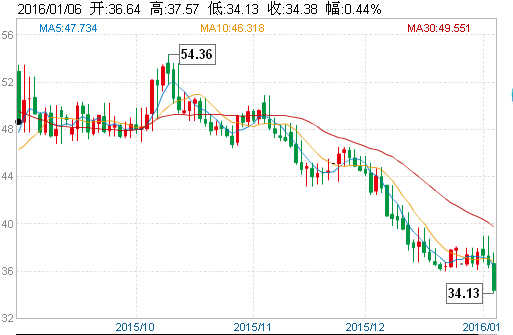 紐約時間1月6日14:30,NYMEX2月原油期貨合約收低2美元或5.6%,報每桶33.97美元,為2008年12月以來最低位水平。