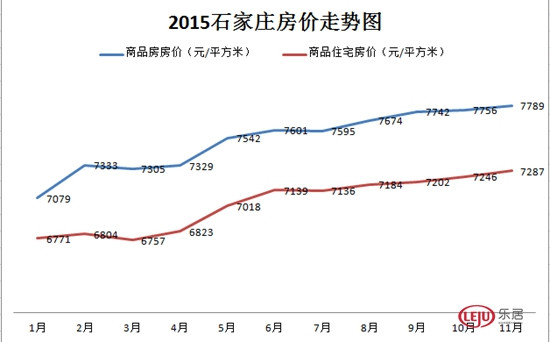 據石家莊市住建局官方統計數據顯示,2015年1-11月商品房均價7789元/平方米,同比上漲7.80%;商品住宅1-11月均價7287元/平方米,同比上漲13.73%。其中11月商品房均價較1月每平米上漲710元,漲幅為10%;11月商品住宅均價較1月每平米上漲516元,漲幅為7.6%。從每月數據變化情況來看,整體呈上漲趨勢,且漲幅較緩。