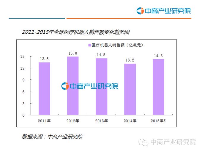 根據IFR的數據,2014年全球醫療機器人銷量為1224臺。其中最重要的應用是外科手術輔助機器人,銷量為978臺,醫療機器人的總銷售額為13.17億美元,占據了專業服務型機器人的35%。未來幾年,全球醫療機器人的銷量年均復合增速達到30%以上。