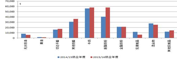 澳大利亞2015/16奶業年度乳制品出口數量截至2015.10