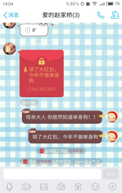 馬上就要回老家了,家住廣州的“單身狗”上班族小趙正苦尋妙計以“逃過一劫”時,母親在家族群中發來一個口令紅包,口令為“領了大紅包,今年不做單身狗”。小趙忍俊不禁,乖乖在群里輸入口令以表決心,最后還不忘回復一個“明年還要發紅包”小小“報復一下”。好友們紛紛表示這個媽媽真的太“潮”了。