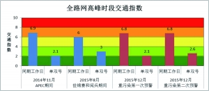 2014年APEC、2015年世錦賽和12月份2次空氣重污染紅色預警單雙號行駛期間的監測數據顯示,全路網工作日早晚高峰平均交通指數在3左右,也就是基本暢通,與單雙號行駛前后工作日早晚高峰平均交通指數在6,也就是中度擁堵以上相比,單雙號行駛期間交通指數降幅在50%左右。