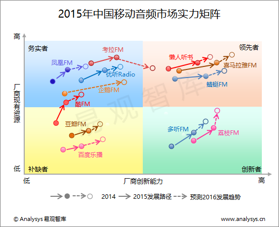 根據Analysys易觀智庫發布的《2015年移動音頻市場實力矩陣專題研究報告》顯示,Analysys易觀智庫對2014年至2016年主要移動音頻渠道商在實力矩陣中所處的位置以及現有資源和創新能力的變化情況做如下解讀。