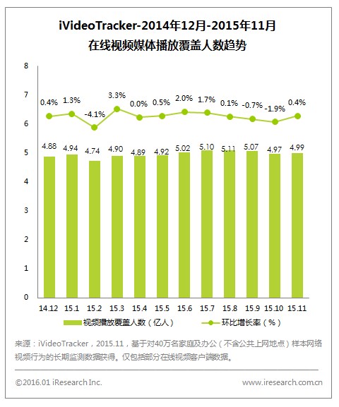 2015年11月在線視頻媒體播放人數(shù)達(dá)4.99億 環(huán)比增0.4%
