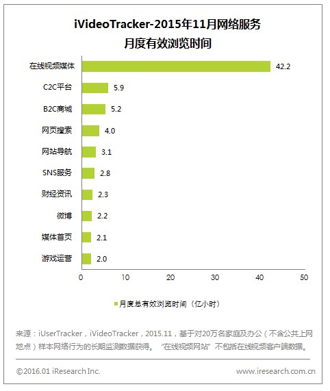 2015年11月在線視頻媒體總有效瀏覽時(shí)間為42.2億小時(shí),較10月增3.4%。在線視頻媒體在有效瀏覽時(shí)間方面繼續(xù)保持巨大優(yōu)勢。