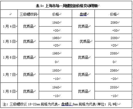 節后申城建材價格先漲后跌。截至1月8日,報在2080元/噸,較節前上漲40元/噸;同期,滬上優質品三級螺紋鋼代表規格報在1940元/噸,較節前上漲30元/噸;而滬上優質盤螺代表規格報價2050元/噸,較節前上漲40元/噸。