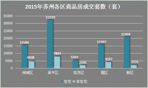 據克而瑞蘇州機構數據統計,2015年蘇州市區(不包括吳江)商品房累計成交111421套,同比去年上漲26.96%,成交面積為12777166.89㎡。其中住宅共計成交90423套,同比去年增加27764套,增幅高達44.31%,成交面積為11018392.22㎡。非住宅成交20998套,成交面積1758774.67㎡。