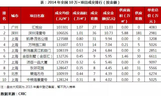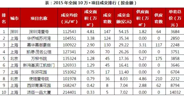 特征2:各項目單價明顯上漲。整體來看,TOP10項目的成交平均價格變化不大,2014、2015年均為11.8萬元/平方米。但從各項目價格表現來看,還是有顯著上漲,如榜首深圳灣壹號均價上漲了6%,而湯臣一品平均售價更是上漲了24%,突破了20萬元/平方米的大關。